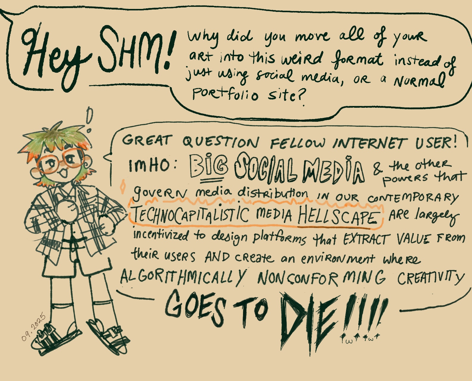 (i do want to work on improving the accessibility & usability & fun of this site, e.g., writing alt text, adding more art and hiding fun secrets... i plan to add a feature where you can share art with me, too...) this will take me some time. ty for ur patience. reach out if you have feedback/ideas!